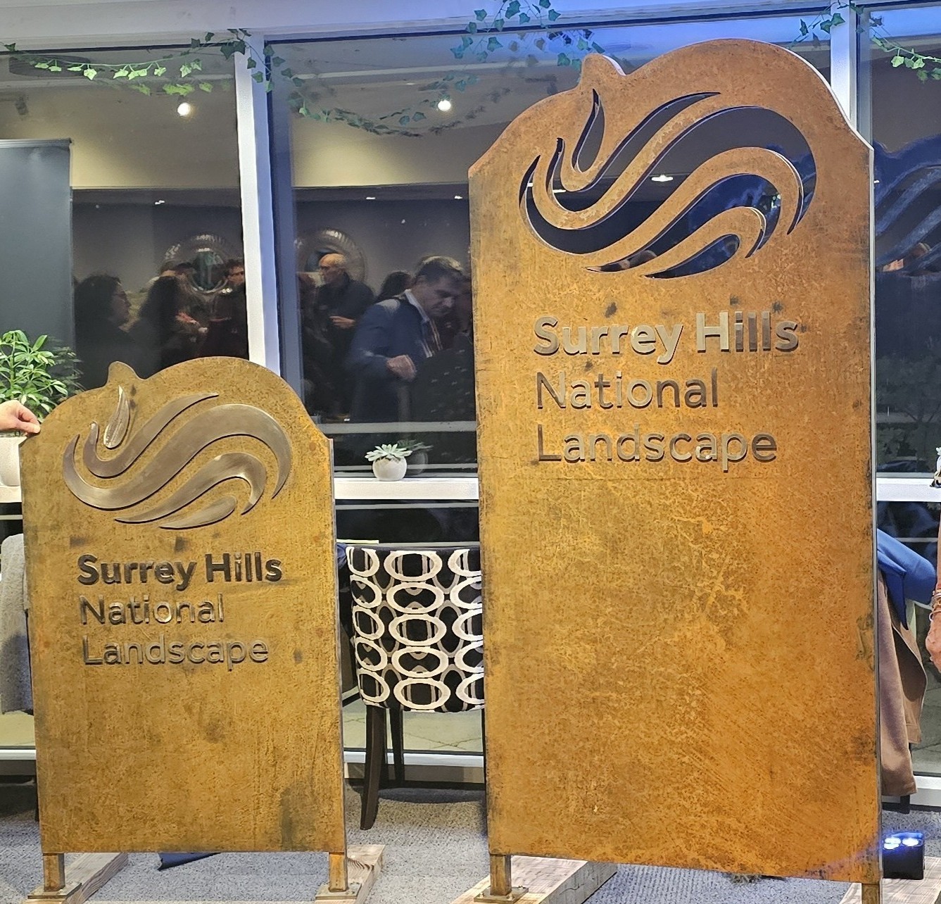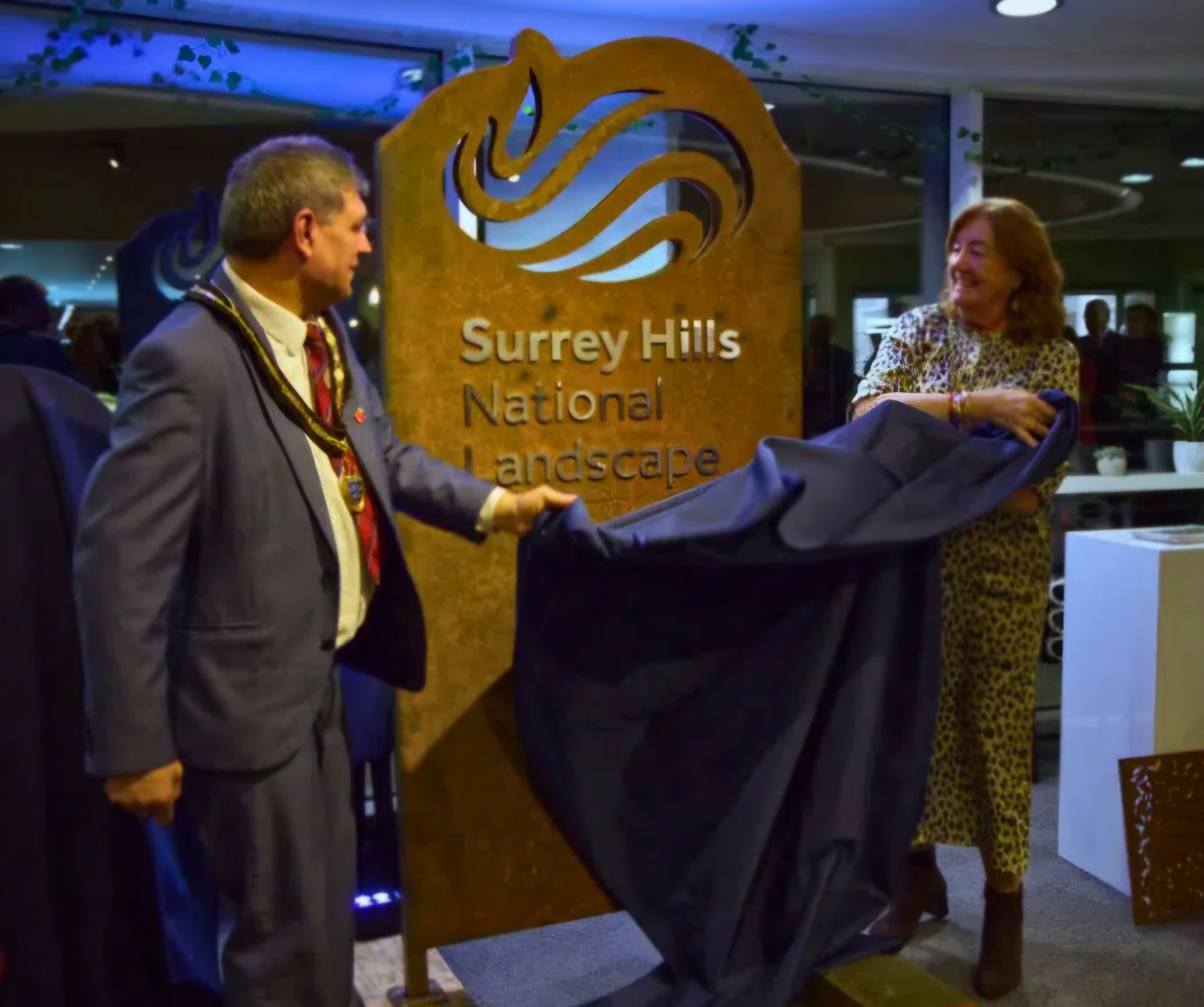 We presented our draft signage at the 2024 Surrey Hills Symposium held in Guildford University where it was unveiled by Saj Hussain, Chairman of Surrey County Council and Cllr Sallie Barker, Mayor of Guildford. The signs were presented to the audience as an ‘Aunt Sally’ to inspire constructive criticism. To our amazement, everyone who spoke to us, or filled in the comment cards, loved the boundary signs with the majority preferring the logo cut out.